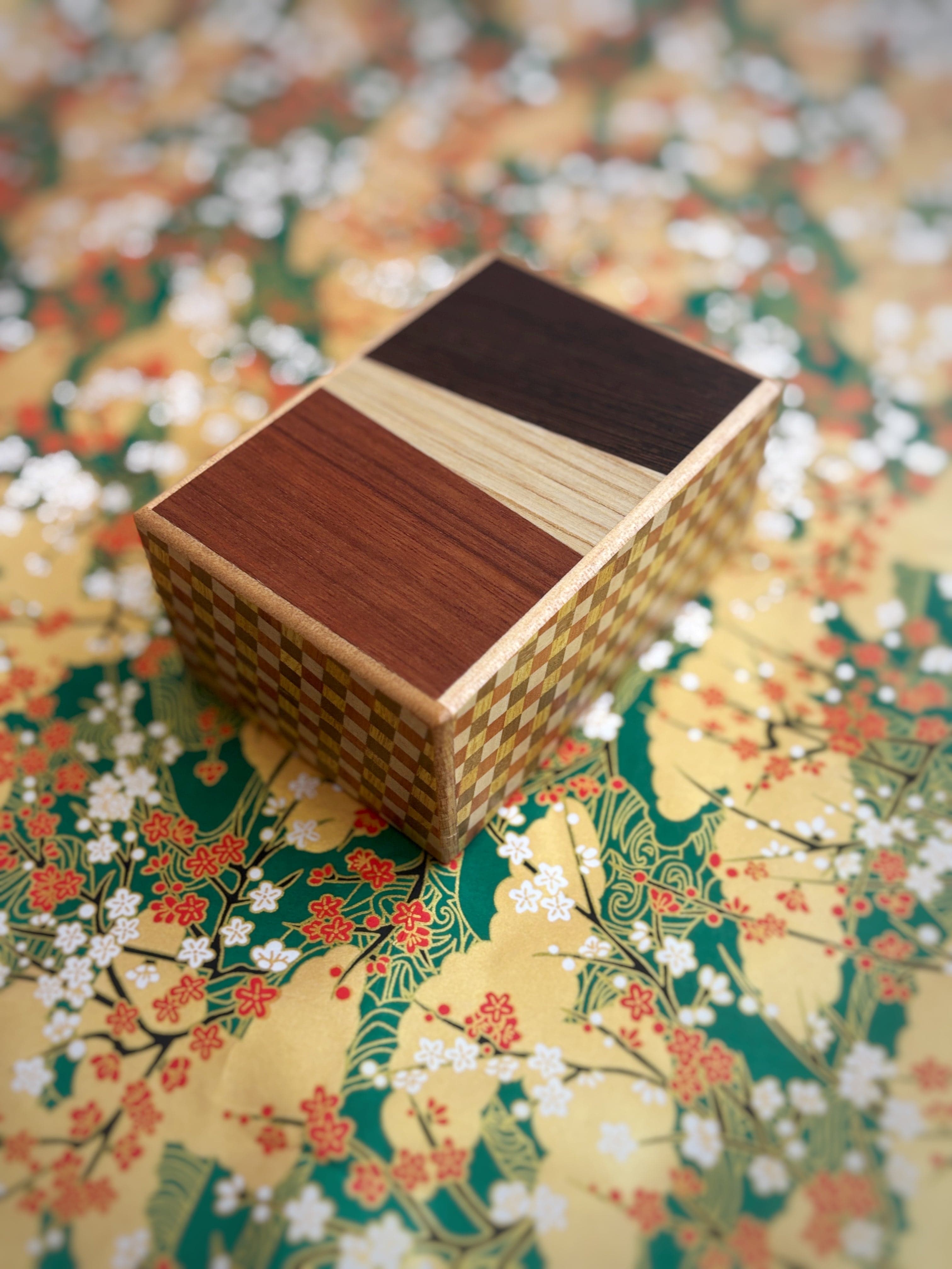 A slice of natural wood is stuck on the top and bottom panels, with the bottom panel being walnut wood. Since each one is handmade, there may be slight differences in the width and direction of the grain. The side panels are ichimatsu yosegi (checkered pattern).